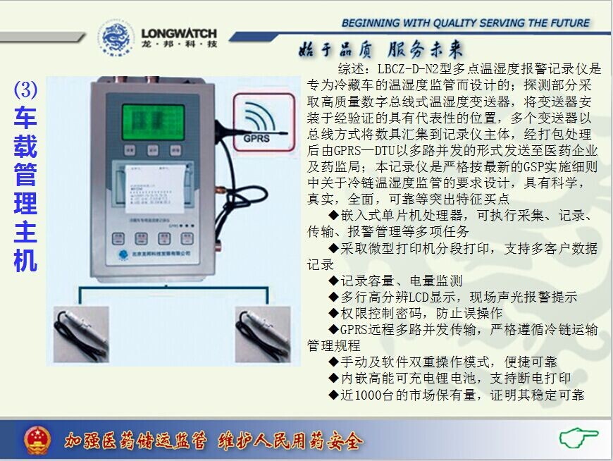 新版GSP規(guī)范中對(duì)于冷藏車溫度監(jiān)測(cè)具體要求為:冷藏車必須具有自動(dòng)調(diào)控溫度、顯示溫度、存儲(chǔ)和讀取溫度監(jiān)測(cè)數(shù)據(jù)的功能。此款溫度儀具備現(xiàn)場(chǎng)快速打印過程曲線報(bào)告的功能,溫度探頭外置,最多可以連接4個(gè)溫度探頭,可以放置在冷藏車廂的任何位置,探頭導(dǎo)線可以根據(jù)車廂的長度延長,顯示記錄的主機(jī)和微型打印機(jī)放置在冷藏車的駕駛室或者安全的環(huán)境,到達(dá)目的地后,隨時(shí)打印記錄過程的溫度數(shù)據(jù),還可以通過USB接口,將所有的溫度數(shù)據(jù),數(shù)據(jù)包括曲線和報(bào)表一起保存至電腦,作永久備份,以備查詢和追溯。全部滿足了相頭的要求。